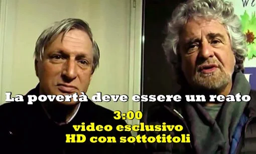 Beppe Grillo: Siamo qui! Abbiamo preso contatto con l'associazione di Don Ciotti, abbiamo parlato di reddito di cittadinanza di povertà e siamo assolutamente d'accordo su questi punti: la povertà deve essere considerata un reato e combattuta con certi sistemi! Stiamo definendo come portare avanti il reddito di cittadinanza, le modalità, insieme perchè siamo assolutamente d'accordo per fare qualcosa in questo senso. Per scardinare questa povertà che aumenta, dieci milioni di famiglie, gente che inizia ad andare a fare la fila alla Caritas , famiglie intere! Non riesco più a capire, non possiamo più restare lì a guardare e vivere in un Paese così. Io non ci riesco a vivere in un Paese così.
