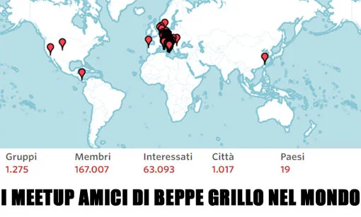 Meet up Amici di Beppe Grillo: 1.275 gruppi in 1.017 città suddivisi in 19 Paesi con 167.007 membri. fonte immagine e dati.