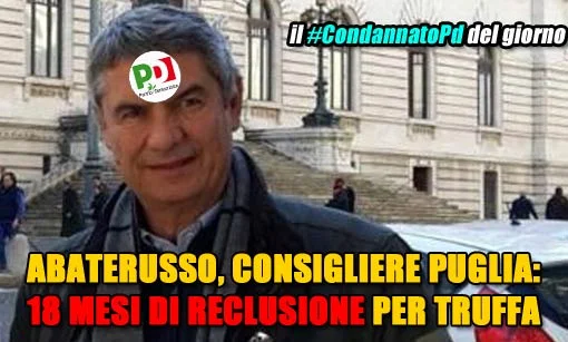 Una nuova figurina nell'interminabile album piddino dei condannati, indagati o arrestati: Ernesto Abaterusso, consigliere regionale Pd in Puglia. Chi sarà il prossimo? I portavoce M5S in Regione Puglia hanno chiesto le dimissioni immediate di Abaterusso: "Chi è raggiunto da condanne simili non può amministrare la cosa pubblica e chi continua a permettergli di farlo è altrettanto colpevole!"