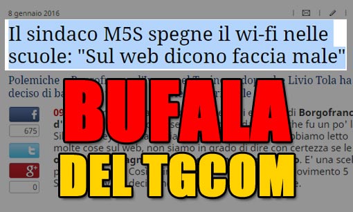 Il Tgcom riporta la notizia falsa che “Il sindaco M5S spegne il wi-fi nelle scuole: “Sul web dicono faccia male“. Il fatto si riferisce a Livio Tola, sindaco di Borgofranco d’Ivrea, che ha deciso di togliere il wi-fi alle scuole elementari e medie del suo paese. E’ falso che Livio Tola sia un sindaco del MoVimento 5 Stelle, infatti è stato eletto con la “Lista Civica – Insieme per Borgofranco” e non rappresenta in alcun modo il M5S. Il Tgcom rettifichi immediatamente. Ps: Il Tgcom dopo la pubblicazione di questo ha modificato l’articolo togliendo qualsiasi a riferimento al M5S, ma omettendo di chiedere scusa ai lettori e al M5S per l’errore commesso. VIDEO Banda larga: pericoli e opportunità
