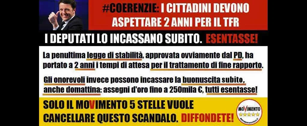 Mentre gli italiani alle prese con la crisi, la disoccupazione e le pensioni da fame devono aspettare due anni per ricevere il trattamento di fine rapporto, gli onorevoli già pieni di privilegi possono incassare subito la liquidazione. Non bastano indennità, rimborsi e vitalizi che costano 300 milioni di euro l'anno, gli onorevoli prendono anche la buonuscita e possono riscuoterla senza attese o addirittura in anticipo. Assegni d'oro fino a 250mila euro, tutti esentasse! Una vergogna che solo il MoVimento 5 Stelle vuole cancellare.