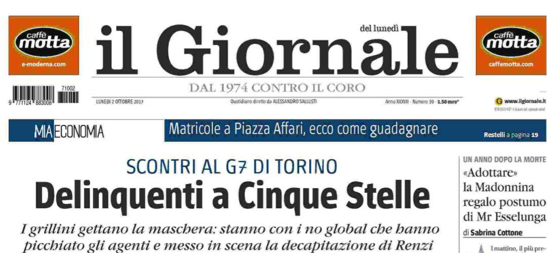 Nel giorno del referendum catalano, la Pravda berlusconiana, spara addosso al MoVimento a caratteri cubitali: “Delinquenti a Cinque Stelle”. Segue una ricostruzione completamente falsa a cura di Francesco Maria Del Vigo in cui afferma che il MoVimento 5 Stelle difende i violenti e lo accusa di complicità con gli organizzatori della macabra provocazione dei manichini. Balle che sono come ordigni lanciati in una piazza per scatenare il panico e la psicosi contro il MoVimento.