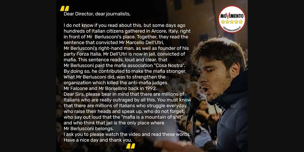 Aiutateci tutti, dobbiamo fare arrivare il nostro messaggio il più lontano possibile. Gli italiani meritano di più di una caricatura che li ha presi in giro per 25 anni e ha pagato la mafia, uno dei mali peggiori del nostro paese. E se le testate italiane hanno paura di dirlo, allora che lo facciano quelle straniere!