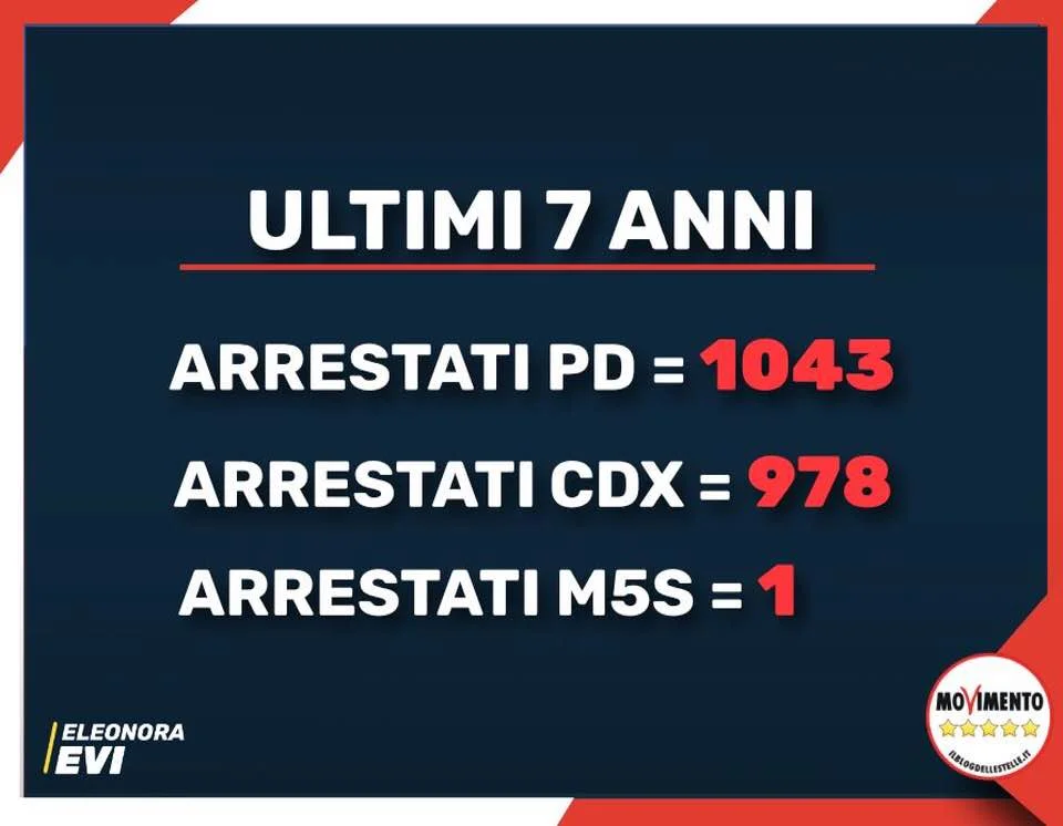 15 aprile 2019 alle ore 08:29Suvvia (Scanzi, Floris, Gruber, Formigli, Berlinguer, Giannini, .....) non vorrete dire che un (1) carcerato del M5S dal 2013 a oggi (7 anni) e come i 1.043 del PD, o i 978 del CDX.
