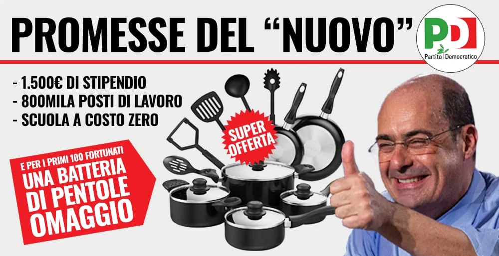 La terza ed ultima proposta del PD si chiama “Scuola a costo zero per 7 milioni di famiglie”, e prevede libri, rette, asili nido gratis. Il provvedimento costerebbe 1,5 miliardi. Interessante: eppure ci sembra di ricordare che fu proprio il PD a governare l'Italia quando la cosiddetta "Buona Scuola" venne approvata. Lo ripetiamo, con Renzi pensavamo di aver toccato il fondo in quanto a balle vendute agli italiani, ma Zinga-Mastrota sembra pronto a spingersi verso limiti inesplorati. Un set di pentole quando? Gli utenti non hanno potuto far altro che farlo notare: