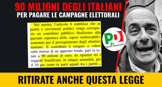 09 Maggio, 2019 Informazione Nuova legge vergogna: il Pd vuole i vostri soldi per pagarsi alberghi, ristoranti e pro... di MoVimento 5 Stelle 38 Commenti Zingaretti si è arreso. Su nostre pressioni, ha finalmente fatto ritirare quella legge ...